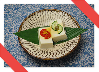 - 固まったら、適当な大きさに切り、薬味(胡瓜のうす切り+柚子胡椒、プチトマトのうす切り+